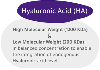 Low molecular weight HA 200 KDa/High molecular weight HA 1200 KDa in a balanced concentration to enable the integration of endogenous Hyaluronic acid level and provide natural hydration effect for the skin.